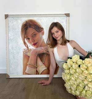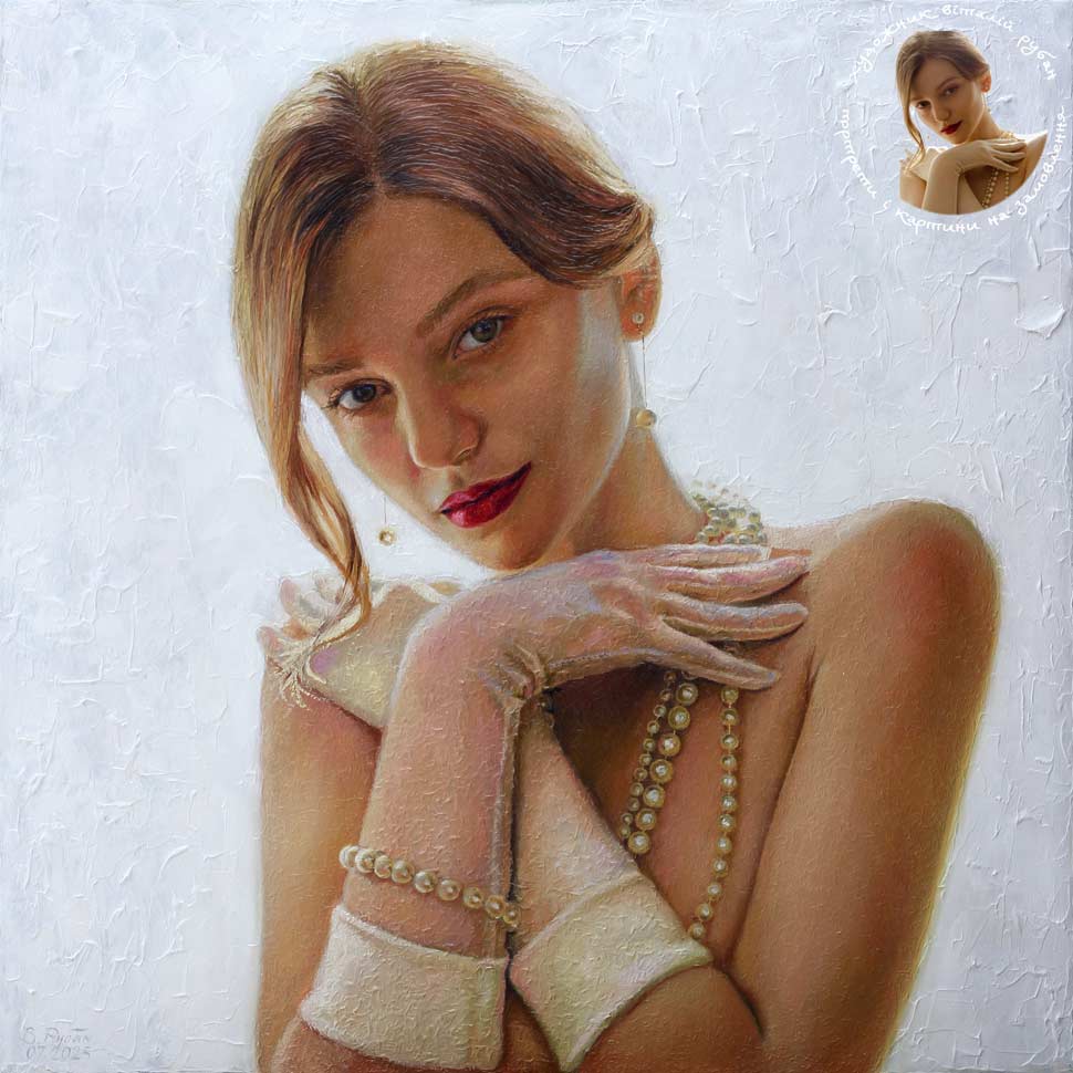 Жіночий портрет. Подарунок від чоловіка для коханої дружини на майбутнє свято дня закоханих. Одного разу в 2011 році дружина вже зверталась до художника за портретом чоловіка. Майже через чотирнадцять років вони помінялися місцями:) Портрети однакового розміру висітимуть в одному приміщенні разом.